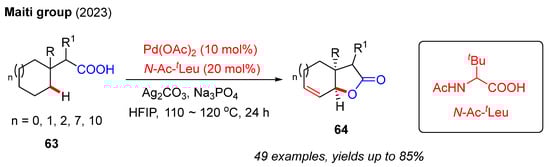 In 2023, Maiti and co-workers demonstrated a novel approach for preparing unsaturated bicyclic lactones 64 from cyclic aliphatic carboxylic acids 63 through Pd(II)-catalyzed cascade intramolecular C(sp3)−H esterification and dehydrogenation (Scheme 22). In the presence of an N-Ac-tLeu ligand, various kinds of unsaturated bicyclic lactones 64, including [5,5]-, [6,5]-, [7,5]-, [12,5]-, and [15,5]-fused lactones, could be isolated in moderate to good yields. Furthermore, substitutions at the α- or β-position of substrates were well tolerated in this process. The proposed reaction mechanism is offered based on DFT calculations. The process started with reversible C–H activation, followed by β-hydride elimination, to produce the Pd-coordinated cycloalkene intermediate. Subsequent stereoselective C–O cyclization with β-hydride elimination generated the final bicyclic unsaturated lactone [43].