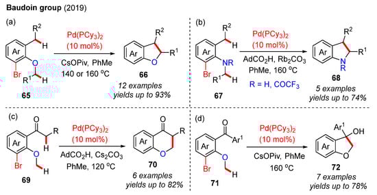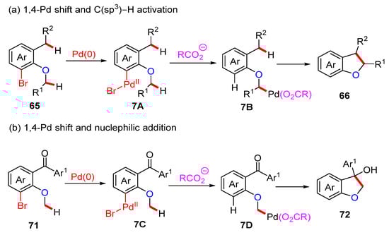 In 2019, the Baudoin group reported the Pd(0)-catalyzed cascade intramolecular C−H activation of trisubstituted aryl bromides to prepare various valuable heterocycles (Scheme 23) [44]. The substrates (65, 69 and 71) bearing an alkoxy group produced 2,3-dihydrobenzofuran (66 and 72) and chroman-4-one derivatives (70). When the substituent was changed to an amino group, the corresponding indolines 68 were isolated. Mechanistic studies show that the initial oxidative addition between the Pd(0) catalyst and the substrate 65 formed the Pd(II) species 7A. Next, the carbonate- or carboxylate-mediated 1,4-Pd shift process generated the alkylpalladium complex 7B, which was further converted into the final product 66 through secondary C(sp3)–H activation. Furthermore, when the substrate was changed to aryl ketone 71, the desired product 72 was generated through a 1,4-Pd shift and subsequent nucleophilic addition (Scheme 24).