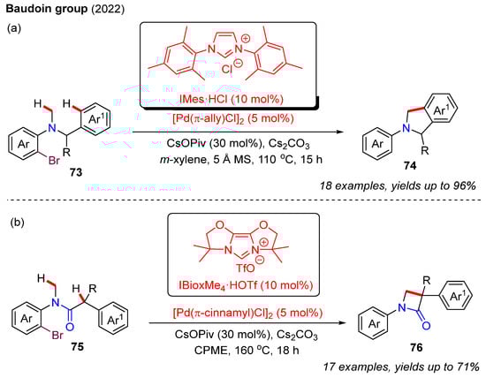 In 2022, the same group used a similar Pd(0)-catalyzed C−H activation strategy to construct isoindoline and β-lactam derivatives [45]. In this reaction, the o-bromo-N-methylaniline substrate 73 underwent a 1,4-Pd shift at the N-methyl group, followed by intramolecular C(sp2)−H activation, to form the desired isoindoline product 74. Notably, this remote second C(sp2)−H activation step is controlled by using the N-heterocyclic carbene (NHC) ligand IMes·HCl (Scheme 25a). In the presence of the NHC ligand IBioxMe4·HOTf, the use of tertiary amide substrate 75 gave rise to the β-lactam product 76 through a cascade 1,4-Pd shift and C(sp3)−H activation (Scheme 25b).