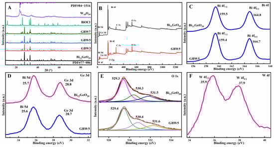 Figure 1. XRD patterns of Bi12GeO20, W18O49, and GBW composites (A), the full-scan XPS (B) and HR spectra of Bi 4f (C), Ge 3d (D), and O 1s (E) of Bi12GeO20 and GBW5, and HR spectrum of W 4f (F) of GBW5.