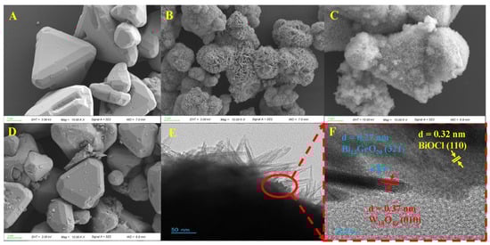 Figure 2. SEM images of Bi12GeO20 (A), W18O49 (B), composite GBW5 (C), and GB5 (D); TEM (E) and HRTEM (F) images of GBW5.