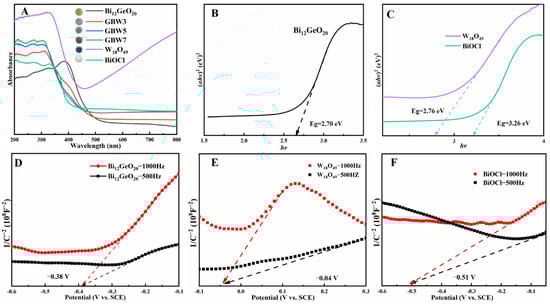 Figure 3. UV–Vis DRS spectra of Bi12GeO20, W18O49, BiOCl and GBW series with color in inset (A), Eg estimation of Bi12GeO20 (B), and W18O49 and BiOCl (C), Mott–Schottky plots of Bi12GeO20 (D), W18O49 (E) and BiOCl (F) measured at different frequencies.