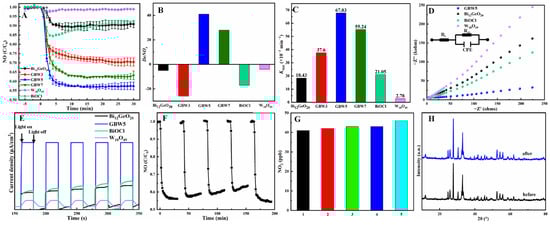 Figure 4. Photocatalytic NO removal under ultraviolet–visible light (A), DeNOx indexes (B), and Kapp values (C) by Bi12GeO20, W18O49, BiOCl, and GBW series, EIS spectra (D) and photocurrent transient responses (E) of relevant samples, photocatalytic NO removal (F) and generation of NO2 (G) by GBW5 for five cycles, XRD patterns of GBW5 before and after five cycles (H).