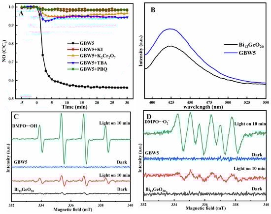 By conducting capture experiments, the reactive species that contribute to photocatalytic processes can be identified. As depicted in Figure 5A, the photocatalytic removal efficiency of GBW5 is greatly inhibited after the addition of reagents KI, PBQ, TBA, or K2CrO7, confirming the crucial roles of species h+, e, ·O2, and ·OH. The generation of ·OH radicals can be directly detected by fluorescence spectroscopy (PL). After light exposure for 30 min, intensive bands centered at 425 nm appear, as shown in Figure 5B, verifying the formation of ·OH radicals in the presence of both Bi12GeO20 and GBW5. Moreover, the fluorescence signal intensity of GBW5 is higher than that of Bi12GeO20, indicating the boosted generation of ·OH radicals due to the strong oxidative capability of these ternary composites. To further detect the formation ·OH and ·O2 radicals, electron spin resonance (ESR) measurements were performed. The typical signals of DMPO-·OH adducts in the spectra of both Bi12GeO20 and composite GBW5 are visible in Figure 5C. Neither Bi12GeO20 nor GBW5 causes the generation of ·OH radicals in the dark. In contrast, evident ESR signals in the spectra of both samples can be found after 10 min of light irradiation, revealing the possible formation of ·OH radicals upon illumination. Moreover, the stronger ESR signals generated with GBW5 compared to those generated with Bi12GeO20 suggest the strengthened production of ·OH radicals because of efficient regulation of interfacial charge carriers in ternary composites. Similar results are found for the appearance of DMPO-·O2 signals in methanol under light illumination in Figure 5D, revealing that more ·O radicals can be produced by GBW5 than by Bi12GeO20. Although the GBW5 and Bi12GeO20 catalytic systems are both able to induce the production of ·OH and ·O2 radicals, the synergistic effect represented by the ternary composites is favorable for the formation of sufficient radicals, thus enhancing photocatalytic NO removal performance [48].