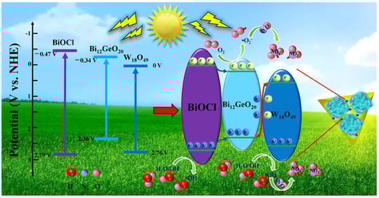 Based on the experimental and analytical results described above, a probable mechanism for photocatalytic NO removal using the GBW composites is proposed in Figure 6. As described, W18O49 and BiOCl phases are generated on the surface of Bi12GeO20, thus the relative position of the three components with relevant band structures is exhibited on the left side of the diagram. The production of a BiOCl phase on the surface of Bi12GeO20 through the comprehensive utilization of “waste” Cl anions may form a heterojunction structure that regulates interfacial charge carriers. In addition, the presence of W18O49 nanosheets is capable of enhancing visible light absorption and promoting the separation of charge carriers. As a result, a synergistic effect is formed at the interface between the three components. Under ultraviolet–visible light, the three components are excited and distribute electrons to the CB and holes to the VB. BiOCl possesses a more negative CB and positive VB than Bi12GeO20, thus, electrons and holes from BiOCl tend to thermodynamically transfer to Bi12GeO20. Because of the faster transfer rate of e than h+, more electrons accumulate in the CB of Bi12GeO20 as revealed by XPS analyses and more holes remain in the VB of BiOCl, thus causing efficient segregation efficiency through a Type I scheme. Subsequently, holes in the VB of Bi12GeO20 can recombine with electrons on Bi12GeO20 and holes on W18O49 through a Z-scheme model. Accordingly, electrons easily convert to ·O2 radical because of the more negative CB potential of Bi12GeO20 (0.34 V) than the potential (O2/·O2, −0.33 V), and holes readily convert to ·OH radicals because of more positive VB potentials of BiOCl (2.79 V) and W18O49 (2.76 V) than potentials (OH/·OH, 1.99 V) and (H2O/·OH, 2.27 V), which can be confirmed by the entrapping experiments, PL spectra, and ESR spectra in Figure 5. As a result, the combination of both Type I and Z-scheme transfer models effectively suppresses the recombination of photogenerated charge carriers, prolongs the lifetimes of charge carriers, and enhances the light-responsive capability, thus facilitating the improvement of photocatalytic NO removal efficiencies of the GBW ternary heterojunction composites.