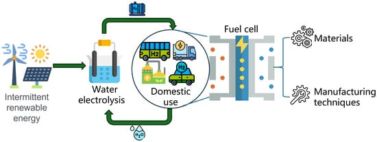 On the materials side, the development of alternative, cost-effective catalysts and advanced membrane materials is crucial for improving efficiency and reducing overall costs [8,9]. Current fuel cell technology relies heavily on platinum-based catalysts, which are expensive and scarce, limiting their widespread adoption. The pursuit of low-Pt and non-precious metal catalysts that exhibit comparable or even superior performance to platinum is essential for making fuel cells more affordable and sustainable [10]. Moreover, the development of high-performance membrane materials that maintain their proton conductivity, mechanical stability, and resistance to degradation under harsh operating conditions is equally important. Research into hybrid, composite, and novel polymeric membranes shows promise in addressing these challenges. In addition, innovations in gas diffusion layers (GDLs), which optimize their porosity, hydrophobicity, and structural integrity, are key to enhancing the transport of reactants and products within the cell, ultimately improving fuel cell efficiency and longevity.