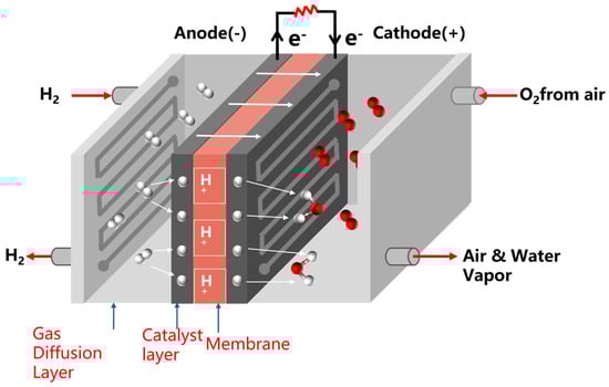 PEMFCs are composed of several key components that work in concert to generate electricity through an electrochemical reaction. At the heart of the PEMFC is the MEA, which includes the proton exchange membrane (PEM), catalyst layers, and gas diffusion layers (GDLs) [13,14]. The MEA is the core unit where the actual fuel cell reaction takes place, and it is surrounded by a series of additional components designed to support and optimize the performance of the cell. As shown in Figure 2, a single PEMFC consists of several parts: the anode, the PEM, and the cathode. The anode is supplied with hydrogen gas, while oxygen (usually from air) is provided at the cathode. The PEM, typically made of a solid polymer electrolyte, allows protons to pass through while preventing the passage of electrons, which flow through an external circuit to generate electricity. The GDLs are positioned on either side of the MEA to evenly distribute the reactant gasses across the catalyst layers and help manage the product water and heat. The catalyst layer is the core component of the MEA and is found between the GDL and PEM. It provides active sites for electrochemical reactions, forming a three-phase interface that facilitates interactions among protons, electrons, and gasses. Moreover, the catalyst layer reduces the activation energy of electrochemical reactions, accelerates reaction rates, and is essential for achieving high-efficiency electrochemical conversion within the MEA.