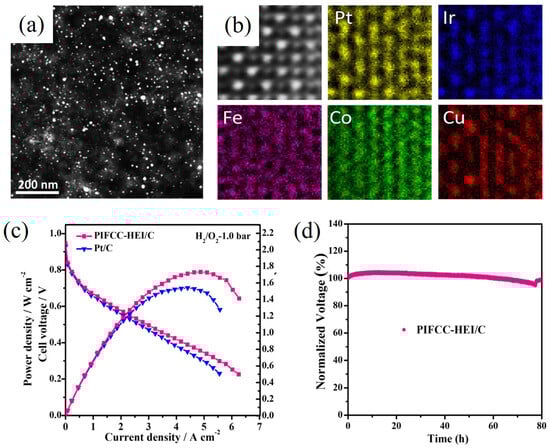 (a) The HAADF−STEM images, (b) atomic−resolution EDS maps, (c) the polarization and power density curves, and (d) long-term stability test of PtIrFeCoCu HEA NPs catalyst. Reprinted with permission from [50]. Copyright 2023, American Chemical Society.
