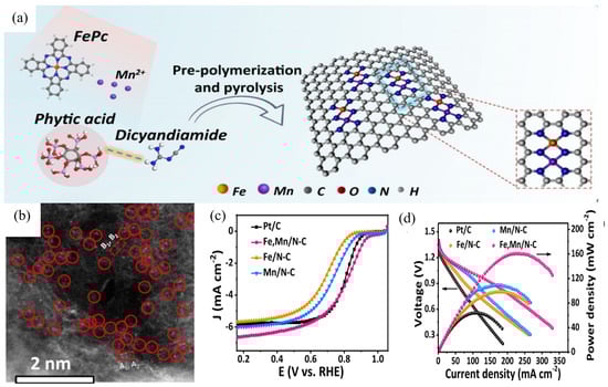 Various strategies have been explored to improve the performance and stability of Fe–N–C-based catalysts for fuel cells [56,57,58]. Researchers have focused on optimizing the synthesis methods, such as controlling the pyrolysis temperature and precursor composition, to enhance the active site density and catalytic activity. Additionally, efforts have been made to refine the catalyst layer structure by reducing the thickness and improving the dispersion of active sites, which can help alleviate mass transfer issues. Another approach involves introducing stabilizing agents or doping with other elements, such as phosphorus or sulfur, to improve the catalyst’s durability and resistance to degradation. Moreover, the introduction of second metal components has been explored to create X, Fe–N–C catalysts, which exhibit enhanced catalytic performance compared to pure Fe–N–C catalysts. For example, Gege Yang et al. [44] prepared a Fe, Mn diatomic nonprecious metal catalyst, where the preparation process was shown in Figure 5. The catalyst has a uniform elemental distribution and is rich in active sites, suggesting good electrocatalytic activity. Electrochemical tests demonstrated that the half-wave potential of Fe, Mn/N-C in 0.1 mol HClO4 is 0.804 V, similar to that of Pt/C. Moreover, the power density of Fe, Mn/N-C was superior to Pt/C, confirming its excellent electrochemical performance.
