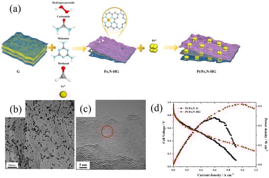 (a) The schematic diagram of the preparation, (b,c) the TEM images (the red circles indicate the holes), (d) the polarization curve of Pt/Fe, N-HG catalyst. Reprinted with permission from [62]. Copyright 2023, American Chemical Society.