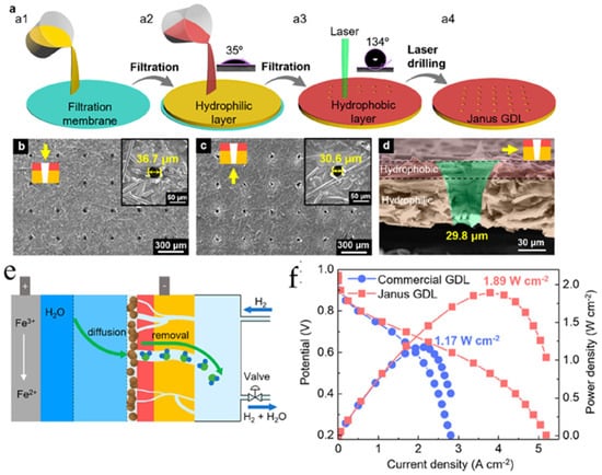 (a1–a4) The schematic diagram of the preparation, (b–d) the SEM images (the arrow shows the direction of the Janus GDL: (b), the hydrophobic side; (c), hydrophilic side; (d), cross-sectional), (e) schematic fuel cell test diagram, (f) the polarization curve of Janus GDL. Reprinted with permission from [121]. Copyright 2022, American Chemical Society.