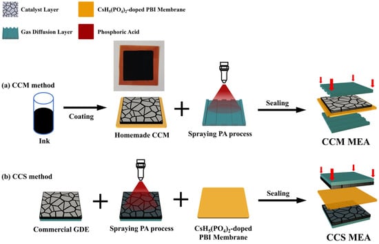 - Li, Y.; Fu, Z.; Li, Y.; Zhang, G. A Comparative Study of CCM and CCS Membrane Electrode Assemblies for High-Temperature Proton Exchange Membrane Fuel Cells with a CsH5(PO4)2-Doped Polybenzimidazole Membrane. Materials 2023, 16, 3925. [Google Scholar] [CrossRef] [PubMed]