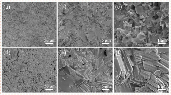 The intrinsic morphology of bulk samples should be observed from the cross section (fracture surface). Accordingly, Fe2B–HPHT’s cross section was observed using scanning electron microscopy (SEM). Figure 2a–c show that the bulk of Fe2B–HPHT has a dense morphology with almost no pores (Figure 2a). From the magnified view of the cross-sectional morphology (Figure 2b,c), it can be clearly seen that the dense surface comprises closely connected micron-size grains with particle morphology. There were two kinds of grain sizes in the samples; one was 0.5–1 μm and another was about 5 μm. Therefore, from the grain growth mechanism, we inferred that big grains grow from the integration of small grains under HPHT. Simultaneously, under the influence of pressure, a good growth interface may be formed between the grains, and the gas or moisture in the material is squeezed to the sample surface, obtaining a good dense bulk material. SEM images, as shown in Figure 2d–f, indicated that the cross section of Fe2B–HS has a certain number of cracks or pores. In addition, the grain size of Fe2B–HS was about 5 μm, and the grain growth in Fe2B–HS followed the step-growth mechanism. Furthermore, during the growth process, the gas or moisture in the pre-pressed bulk sample was released from the material, because of which many pores or cracks appeared in Fe2B–HS. The difference in morphology between Fe2B samples prepared via the two methods is mainly attributed to the following: During the sintering process at atmospheric pressure and high temperature, the grain growth could relax to the most stable state, as a result of which the grains in Fe2B–HS have anisotropic growth rates in different directions and are generated via the step-growth mechanism. However, the pressure suppresses atomic diffusion and reduces the growth rate of the crystal planes, which have a higher growth rate in Fe2B–HS; thus, relatively isotropic growth rates in Fe2B–HPHT result in particle morphology.