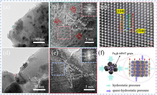 (a) TEM images of Fe2B–HPHT; (b) HRTEM images of Fe2B-HPHT, with the insert showing a fast Fourier transformation (FFT) pattern of the pink-framed area; (c) the inverse fast Fourier transformation (IFFT) pattern of the pink-framed area in (b); (d) TEM images of Fe2B–HS; (e) HRTEM images of red-framed area in (d), with the insert showing an FFT pattern of the light-blue-framed area; and (f) a diagram of SF formation in Fe2B–HPHT.