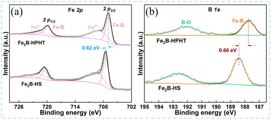 X-ray photo-electron spectroscopy (XPS) was performed to investigate the surface chemical states of Fe2B prepared via the two methods. Fe 2p spectra are shown in Figure 4a. Binding energies of 706.89 and 719.85 eV belonged to 2 p3/2 and 2 p1/2 of Fe–B in Fe2B–HPHT, respectively, and binding energies of 707.51 and 720.46 eV belonged to 2 p3/2 and 2 p1/2 of Fe–B in Fe2B–HS, respectively [41,51]. However, binding energies of 709.01 and 721.57 eV in Fe2B–HPHT and those of 709.61 and 721.83 eV in Fe2B–HS corresponded to the presence of Fe3+ at the surface of the samples, which may have been due to the oxygen absorbed during the test environment or surface partial oxidation [52]. The detection of the Fe–B peak confirmed that Fe2B was successfully synthesized by both methods, and the result was in agreement with XRD and HRTEM analyses (Figure 1c and Figure 3b). Meanwhile, an Fe–B peak (187.75 eV) and a B–O peak (192.11 eV) in Fe2B–HPHT were also detected via B 1s spectroscopy (Figure 4b) [37,53]. Interestingly, the binding energy position of Fe–B in Fe2B–HPHT was lower than that in Fe2B–HS, about 0.62 eV lower in Fe 2 p3/2 and 0.66 eV lower in B1s. This phenomenon may be attributed to the presence of SFs in the structure of Fe2B–HPHT, which makes it possible to exist only via the transfer of a small number of electrons between Fe and B.