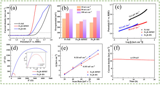 (a) Polarization curves of Fe2B–HPHT, Fe2B–HS, and Fe foil in 1 M KOH electrolyte for the OER; (b) comparison of overpotentials of Fe2B–HPHT, Fe2B–HS, and Fe foil at 10, 50, and 100 mA cm−2 in 1 M KOH; (c) Tafel slope; (d) Nyquist plots; (e) double-layer capacitances; and (f) curve for current density vs. time (I–t) with Fe2B–HPHT for the OER.