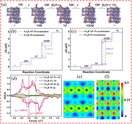 (a) OER process of the Fe2B–SF structural model with B termination; (b) the Gibbs free–energy (ΔG) diagram of Fe2B and Fe2B–SF on the (001) crystal plane with B termination; (c) the Gibbs free-energy (ΔG) diagram of Fe2B and Fe2B–SF on the (001) crystal plane with Fe termination; (d) partial density of states (PDOS) of Fe2B and Fe2B–SF; (e) plots of the electron location function for the Fe2B (100) crystal plane slice; and (f) plots of the electron location function for the Fe2B–SF (100) crystal plane slice. The * in figure represents the “active site”.