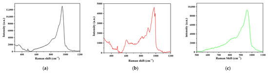 The Raman spectra (Figure 2b) of the dried catalyst with tartaric acid and polyethylene glycol exhibited well-defined lines at 970 cm−1, characteristic of a main component PMo12O403− [27], which should have precipitated in the pore of the alumina. Depending on the PH, the position of the line characteristic of the Mo-O-Ni vibrational mode slightly shifts in these heteropolyacid structures. The classic reported oxomolybdate phase is evidenced as a PMo12O403− structure, responsible for high hydrotreating activity. The Raman spectra (Figure 2c) of reference catalysts only show one main peak at 952 cm−1, which is similar to Figure 2a.