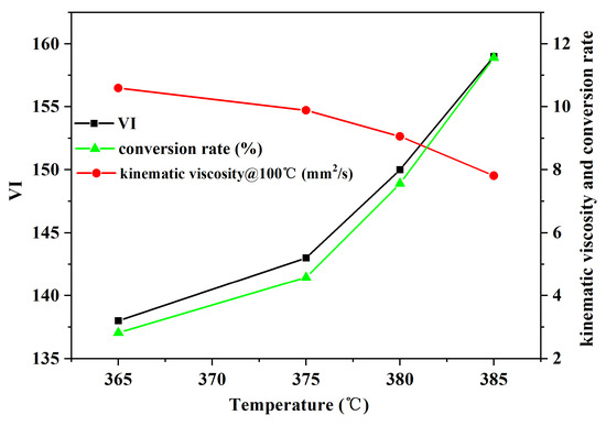 The change in VI, kinematic viscosity and conversion rate for processing heavy gas oil with different temperatures.
