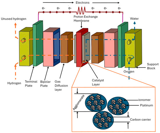 The PEMFCs are composed of several components that together form a membrane electrode assembly (MEA). A cross-section of commercial MEA is visible in Figure 1.