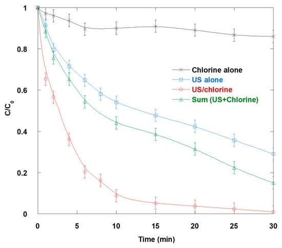 Figure 2a,b illustrate two design and diagnostic points. When interpreting sonochlorination kinetics, it is important to confirm the presence of residual chlorine. Otherwise, apparent process failures may be dechlorination artifacts. Using AA as a mechanistic probe yields valuable information. The significant difference in reactivity between ultrasonication alone and sonochlorination at the same AA levels indicates that the increased reactivity in US/chlorine comes from chlorine-derived RCS rather than •OH alone.