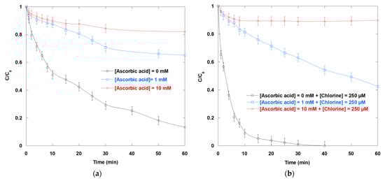 Figure 2 shows ARAC destruction by (a) ultrasonication and (b) sonochlorination in the presence of AA (1 and 10 mM). As shown in the two panels, the addition of AA, a rapid two-electron reductant and well-known chlorine quencher, consistently prevents the removal of ARAC during ultrasonication and sonochlorination. This inhibition is far more pronounced when chlorine is present. In drinking water treatment, AA reacts with chlorine (HOCl/OCl−) to form chloride with essentially instantaneous kinetics (within seconds) and a 1:1 stoichiometric ratio [15]. This reaction produces dehydroascorbic acid. This explains why AA is a standard quenching agent for chlorine/disinfection by-products sampling and why even mM concentrations of AA can extinguish oxidant activity at sub-mM chlorine doses. In sonochlorination system, 1 mM AA is four times a 250 µM chlorine dose, and 10 mM is forty times. Thus, the nearly flat traces at 10 mM AA in the sonochlorination panel are consistent with immediate dechlorination, which prevents sonochlorination altogether.