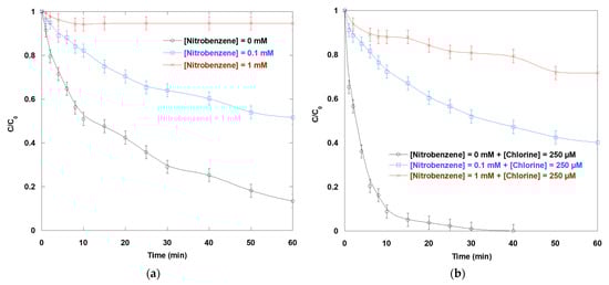 ARAC destruction by (a) ultrasonication and (b) sonochlorination in the presence of nitrobenzene (600 kHz, 120 W, [ARAC] = 5 mg/L, [chlorine] = 250 µM, 25 °C, and pH 5.5).