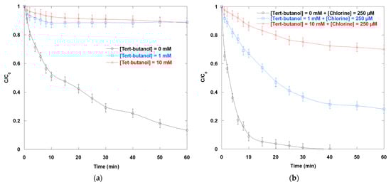 Figure 4b shows that TBA levels suppress, but do not eliminate, ARAC degradation during sonochlorination. This partial resilience reflects the mixed oxidant suite generated when ultrasound activates chlorine, creating RCS in addition to •OH. TBA efficiently removes the •OH contribution but is a comparatively poor sink for Cl2•− (kTBA+Cl2•− ≈ 2.6 × 104 M−1 s−1 [20]) and only a moderate sink for ClO• (kTBA+ClO• ≈ 1.3 × 107 M−1 s−1 [10]). Thus, even at TBA concentrations of 1–10 mM, RCS-mediated oxidation of ARAC persists, yielding the shallower, but still descending, curves in the sonochlorination panel. Although Cl• reacts rapidly with TBA (typically 108–109 M−1 s−1 [18]), Cl• is short-lived and largely partitions into Cl2•−/ClO• under aqueous, chlorine-rich conditions. Therefore, quenching Cl• alone cannot fully collapse the hybrid pathway. These kinetic contrasts (•OH vs. RCS) quantitatively account for the different degrees of inhibition in ultrasonication versus sonochlorination.