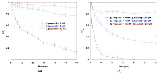 In sonochlorination (Figure 5b), the degradation curve without IPA exhibits the anticipated rapid decay upon exposure to ultrasound. This reflects the sonochemical activation of HOCl/OCl− into reactive chlorine species (RCS), specifically Cl• and Cl2•−. These species work with •OH to create the hybrid process. Although adding IPA slows the process, degradation persists at 1 mM because •OH is not the only oxidant. The RCS continue to attack ARAC even when much of the •OH budget is quenched. This selectivity stems from the fact that IPA reacts extremely quickly with •OH (typically 108–109 M−1 s−1 for hydrogen abstraction from organics) and moderately with Cl2•− (kCl2•−+IPA ≈ 103–105 M−1 s−1 [18]). Thus, a significant portion of the RCS pathway survives mM IPA. At 10 mM, however, there is enough IPA to intercept both •OH and a significant amount of RCS. This results in the collapse of much of the synergy and produces the near-plateau observed.