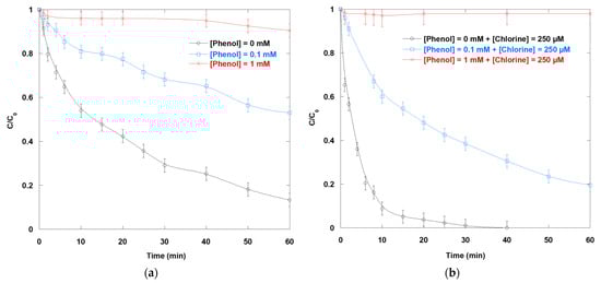 ARAC destruction by (a) ultrasonication and (b) sonochlorination in the presence of phenol (600 kHz, 120 W, [ARAC] = 5 mg/L, [chlorine] = 250 µM, 25 °C, and pH 5.5).