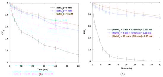 Finally, two contextual notes help interpret Figure 7a,b. First, sonochemical studies report that high-power ultrasound can generate small amounts of nitrite and nitrate from air-saturated water. Although this is minor under conditions typically used for dye abatement, it further emphasizes how sensitive radical processes are to nitrate chemistry. Second, the HOCl–NO2− reaction is pH-dependent and often accelerates as the pH decreases (where HOCl dominates). Thus, the extent of inhibition in Figure 7b would be expected to increase under more acidic operating conditions. These considerations are consistent with the sharper loss of reactivity under sonochlorination than under ultrasound alone once nitrite is present.