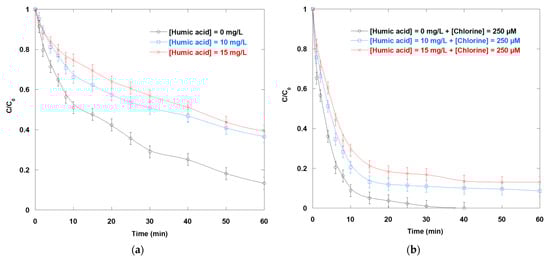ARAC destruction by (a) ultrasonication and (b) sonochlorination in the presence of humic acid (600 kHz, 120 W, [ARAC] = 5 mg/L, [chlorine] = 250 µM, 25 °C, and pH 5.5).