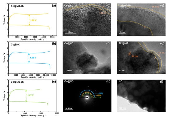 Discharge/charge curves of LOB with (a) Co@NC-2h, (b) Co@NC and (c) Co@NC-6h at different current density of 200 mA g−1 between 2.0 and 4.5 V, TEM images of (d) Co@NC-2h, (e) Co@NC-6h and (f,g) Co@NC, (h) Selected area electron diffraction pattern of Co@NC, (i) TEM images of NC.