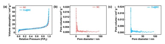 (a) Nitrogen adsorption–desorption isotherm curve; pore size distribution curve of (b) NC and (c) Co@NC.