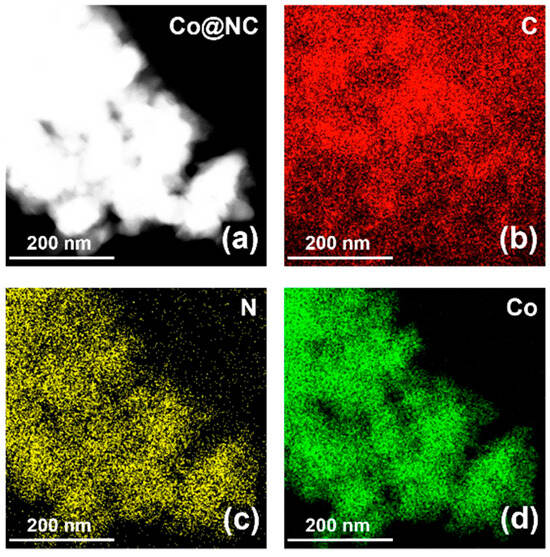 EDS mappings of (a) Co@NC with a scale bar of 200 nm. Panels labeled as (b) C, (c) N and (d) Co are EDS mappings of corresponding elements.