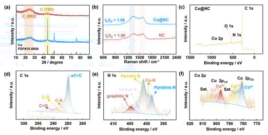 (a) XRD patterns of Co@NC and NC samples, (b) Raman patterns of Co@NC and NC samples, (c) XPS spectra of Co@NC, (d) C 1s XPS spectra of Co@NC, (e) N 1s XPS spectra of Co@NC, (f) Co 2p XPS spectra of Co@NC.