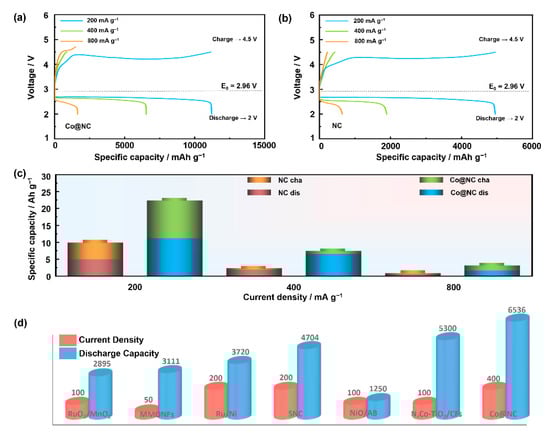 Discharge/charge curves of LOB with (a) Co@NC and (b) NC at different current density of 200, 400 and 800 mA g−1 between 2.0 and 4.5 V, (c) the specific discharge/charge capacities of LOB with different catalysts evaluated across various current densities, where ‘cha’ denotes the charging stage and ‘dis’ the discharging stage, (d) performance comparisons of Co@NC and other representative published efforts.