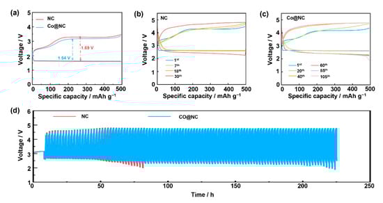 (a) Initial discharge/charge profiles of different cathodes at current density of 500 mA g−1 under the limited capacities of 500 mAh/g, Discharge/charge profile of (b) NC and (c) Co@NC catalyst at current density of 500 mA g−1 under the limited capacities of 500 mAh/g, (d) Cyclic performance of Li-O2 batteries with different catalysts at current density of 500 mA g−1 under the limited capacities of 500 mAh/g.