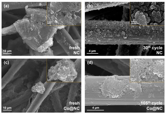 Post-mortem examination of cycled LOBs provided pivotal insights into the dynamic evolution of cathode surfaces and their direct correlation with electrochemical performance metrics. Subsequent disassembly and SEM characterization of post-cycling cells revealed striking morphological disparities across the tested cathode architectures, offering visual validation of structural-performance relationships. For NC cathodes (Figure 8a,b), irregular state deposits with high packing density completely enveloped the electrode surfaces after cycling [38]. These indissoluble Li2O2/Li2CO3 hybrid products formed a passivating layer that progressively occluded catalytic active sites. The resultant three-phase interface (TPI) degradation severely impeded mass transport of electrons, Li+ ions, and superoxide radicals (O2−), creating a kinetic bottleneck [39]. This passivation phenomenon, corroborated by reduced discharge potentials (the discharge cut-off potential below 2 V after 30 cycles), accelerated parasitic reactions including electrolyte decomposition and carbon corrosion, ultimately precipitating premature cell failure. In stark contrast, the Co@NC cathode (Figure 8c,d) exhibited exceptional passivation resistance. SEM imaging revealed minimal surface deposition even after extended cycling, confirming exposed active sites. This exceptional stability arises from synergistic effects: carbon coating enhances cobalt particle stability and accelerates Li2O2 decomposition kinetics, while nitrogen-doped porous carbon maintains structural integrity under electrochemical stress. The preservation of three-phase interface (TPI) functionality, unobstructed by thick insulating layers, is evidenced by stable charge–discharge overpotentials and negligible capacity degradation throughout cycling.