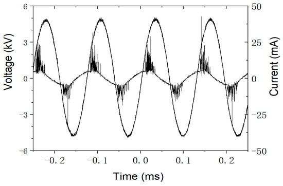 The waveforms of applied voltage and discharge current recorded by an oscilloscope in He discharge.