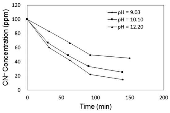 Under acidic conditions, CN− can be converted into volatile HCN which is highly toxic and should be avoided. Wastewater containing CN− should be kept under basic conditions, and the basicity was adjusted in the range 9.03–12.20 by HCl and NaOH to investigate the effect of pH on the degradation of CN−. As shown in Figure 5 the degradation rate at a pH of 9.03 was the fastest. To avoid the evolution of hydrogen cyanide, the cyanide water was set at a pH value of 10 in the experiments.