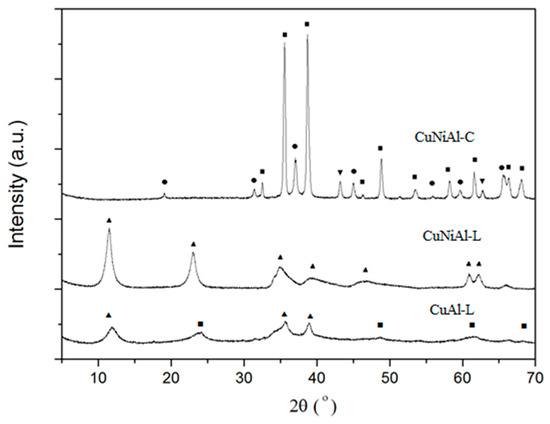 The XRD patterns of the as-synthesized CuNiAl-L, CuAl-L LDHs, and calcined CuNiAl-C catalysts. Symbols indicate the presence of hydrotalcite (▲), CuO (■), NiO (▼), and spinel (●) phases.