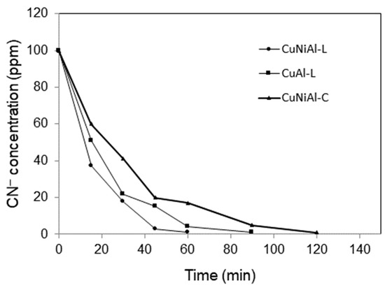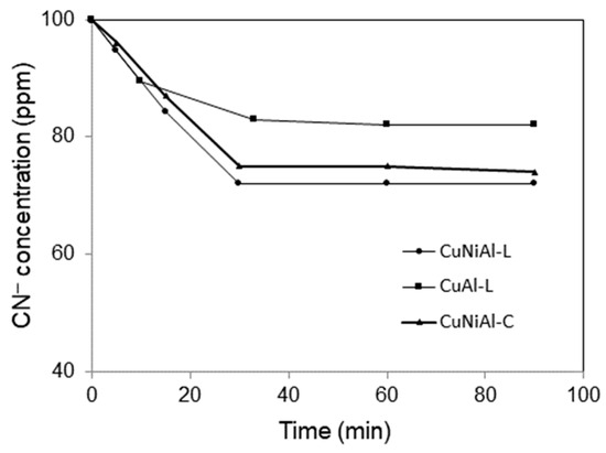 To investigate the physisorption of cyanide ions by CuNiAl-L and CuAl-L and the calcined CuNiAl-C catalysts., 0.1 g of catalyst was added into the cyanide water containing 100 ppm of CN− under vigorous stirring, and the concentration of cyanide ions was analyzed at different time intervals. As shown in Figure 8, the CuNiAl-L catalyst had a stronger affinity to the cyanide ions. After 1 h of adsorption equilibrium, the concentration of cyanide ions decreased from the initial 100 ppm to 72 ppm and 82 ppm with the CuNiAl-L and CuAl-L catalysts, respectively. This phenomenon is likely attributable to both the higher surface area of the former catalyst and the stronger affinity between nickel and cyanide ions. The concentration of cyanide ions observed for the calcined CuNiAl-C at adsorption equilibrium was 75 ppm, higher than that with the CuNiAl-L catalyst. This may possibly be due to the crystal phase transformation coupled with the loss of the specific surface area after calcination of the hydrotalcite phase.