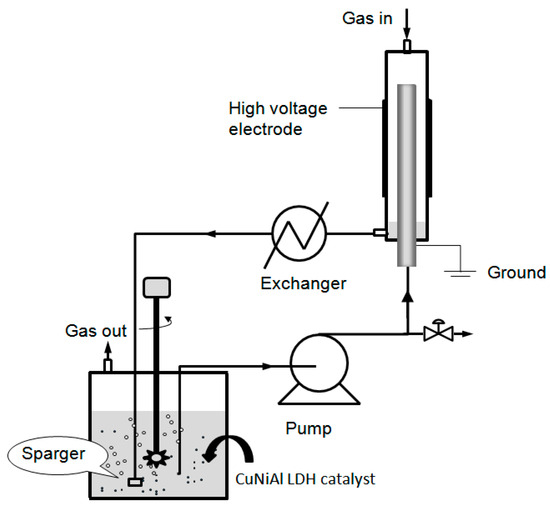 The DBD plasma–catalyst loop reactor setup shown in Figure 9 comprised a quartz tube and a concentric stainless tube. The quartz tube had dimensions of 22 mm o.d. × 18 mm i.d. × 250 mm length. Wrapped on the external surface of the quartz tube was the stainless steel mesh, which was used as a high-voltage electrode. Stainless steel of the dimensions 8.0 mm o.d. × 3.0 mm i.d. was mounted inside the quartz tube and served as the ground electrode. Gas feed (He, N2 and O2), controlled by mass flow controllers, was introduced through the opening on the top of the quartz tube. The water sample was introduced into the inner pore of the stainless steel tube from the bottom by a peristaltic pump. The water sample left from the top of the stainless tube and flowed down along the external surface of stainless steel tube as a thin falling film. The gas and water sample left the reactor from the bottom opening of the quartz tube, passed through a tube and shell heat exchanger, and were collected in the reservoir. The gas was then vented from the top opening of the reservoir, and the cyanide water was pumped using the peristaltic pump to circulate it inside the plasma loop reactor. The DBD plasma discharge was generated in the circle slit between the quartz tube and stainless steel tube.