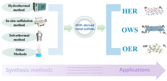 Over the past several years, researchers have adopted various strategies such as the solvothermal method [22], hydrothermal method [23], in situ sulfidation method [24], and other methods [25] to prepare MOF-derived metal sulfides using MOFs as precursors. These materials have been widely applied in various electrochemical energy conversion systems due to their outstanding physical and chemical performances, such as OER [26], HER [27], and OWS [28]. While several reviews have summarized the applications of MOF-derived transition metal sulfides in energy conversion [13,29,30,31,32], a comprehensive summary of the primary synthesis methods and electrochemical water splitting (such as OER, HER, OWS) of MOF-derived metal sulfides over the past several years remains lacking. Given the growing interest in this class of materials within the electrochemical research community, a systematic review of their synthetic approaches and application progress (Figure 1) is highly desirable.