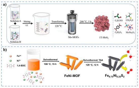 In another example, Ke et al. synthesized the Fe0.75Ni0.25S2 nanorods via a two-step solvothermal approach (Figure 2b) [39]. In the first step, FeCl3·6H2O, Ni(NO3)2·6H2O, and terephthalic acid were dissolved in DMF and subjected to solvothermal treatment at 100 °C for 15 h, yielding the FeNi-MOF precursor. In the second step, the FeNi-MOF precursor and TAA were dissolved in ethanol and reacted under solvothermal conditions at 120 °C for 12 h. After post-treatment, the Fe0.75Ni0.25S2 nanorods were synthesized. Particularly, the prepared Fe0.75Ni0.25S2 nanorods catalyst exhibited a low overpotential of 247 mV for oxygen evolution at 10 mA cm−2 in alkaline media, along with noteworthy electrochemical stability for over 40 h.