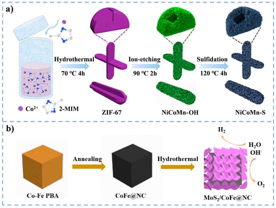 (a) The preparation process of hollow rod-like NiCoMn-S ternary metal sulfide [48]. Copyright 2021, Elsevier. (b) Schematic illustration of the formation process of MoS2/CoFe@NC nanostructure [49]. Copyright 2023, The authors.