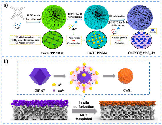 (a) Schematic illustration of preparation process for CuSNC@MoS2-Pt electrocatalyst [56]. Copyright 2020, Elsevier. (b) Schematic illustration of the fabrication of CoSx composite membrane [57]. Copyright 2021, Elsevier.