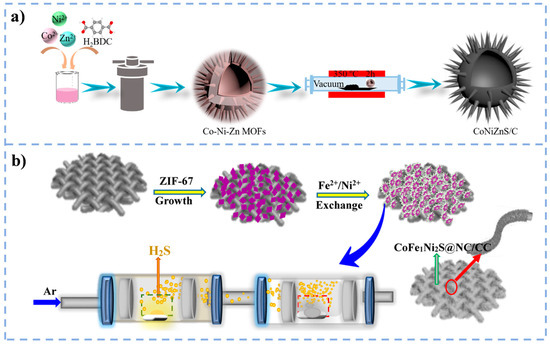 (a) Schematic illustration for the fabrication process of CoNiZnS/C composite [62]. Copyright 2022, Elsevier. (b) Schematic description of the fabrication of CoFeNiS@NC/CC [65]. Copyright 2025, American Chemical Society.