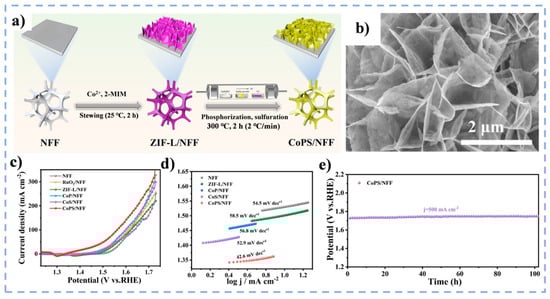 For example, Chu et al. prepared a CoPS/Ni-iron foam (CoPS/NFF) heterostructured with an ultrathin nanosheet morphology through a one-step phosphidation–sulfidation process (Figure 6a) [26]. In this report, ZIF-L/NFF composites were first fabricated by growing the ZIF-L on NFF through a simple process. Subsequently, the CoPS/NFF composites were obtained by treating the ZIF-L/NFF composites via a simultaneous phosphidation and sulfidation process. The obtained CoPS/NFF composites particularly exhibit an ultrathin nanosheet morphology (Figure 6b). This structure, combined with abundant open space, provides a large specific surface area and numerous active sites, thereby significantly enhancing OER efficiency. As presented in Figure 6c, the linear sweep voltammetry (LSV) curves indicate that CoPS/NFF composites exhibit the highest OER activity, requiring an overpotential of 190 mV at 20 mA cm−2. Moreover, it has a lower Tafel slope (Figure 6d) than those of other catalysts, suggesting superior reaction kinetics. It also demonstrates exceptional stability, maintaining activity for 100 h at 500 mA cm−2 (Figure 6e), confirming its high activity and long-term durability. The outstanding OER performance of the CoPS/NFF composites is due to their high density of active sites and enhanced electron transport properties.